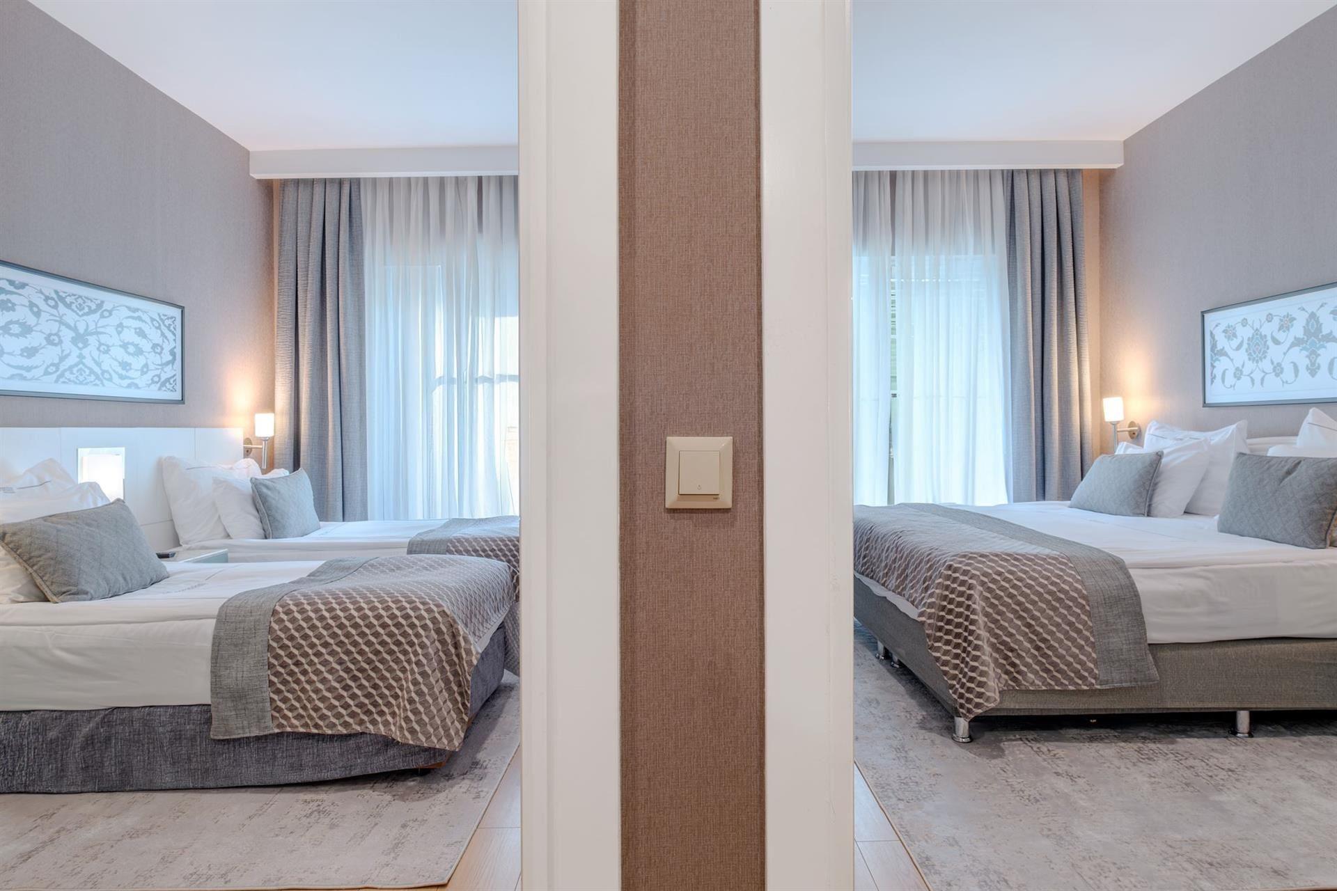 Номер: 48 м², основна будівля, 2 спальні, двоспальне та 2 односпальні ліжка, міжкімнатні двері, 2 ванні кімнати з душем, 2 балкони, краєвид на околиці.