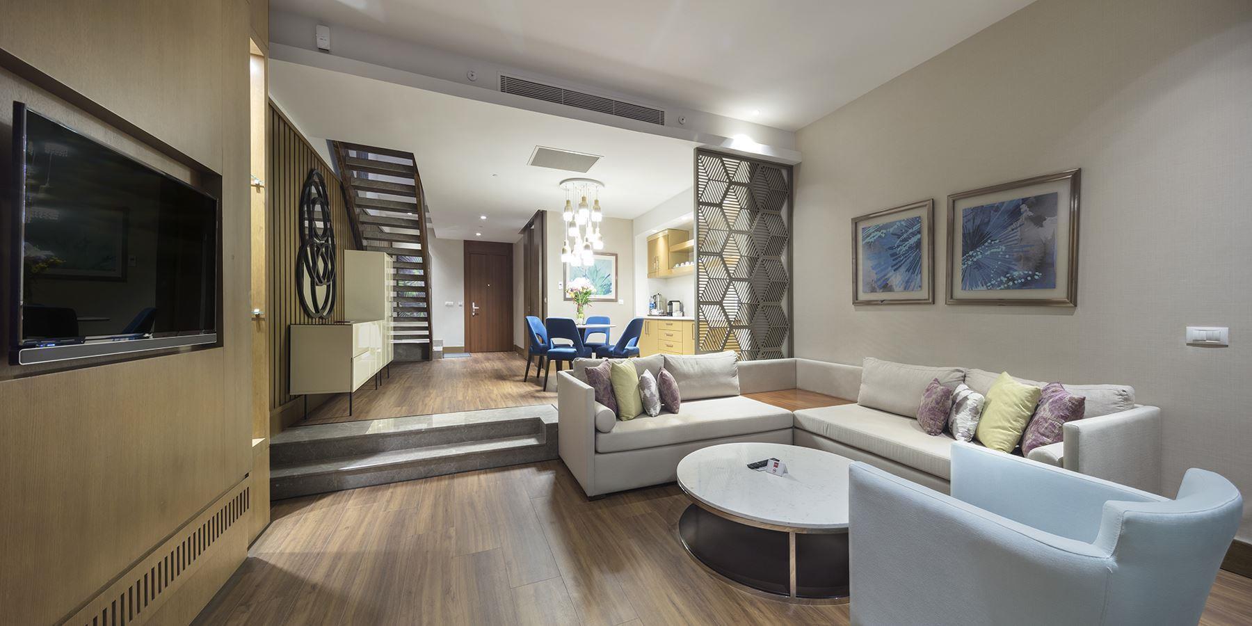 Номер: 120 м², спальня з вітальнею на нижньому поверсі і спальня на верхньому, двоспальне ліжко і 2 односпальні, софа, міжкімнатні двері, 2 ванні кімнати (душ), кухня і обідній стіл, великий балкон, тераса, краєвид на сад і басейн, басейн, максимальне розміщення — 2+2 чол.