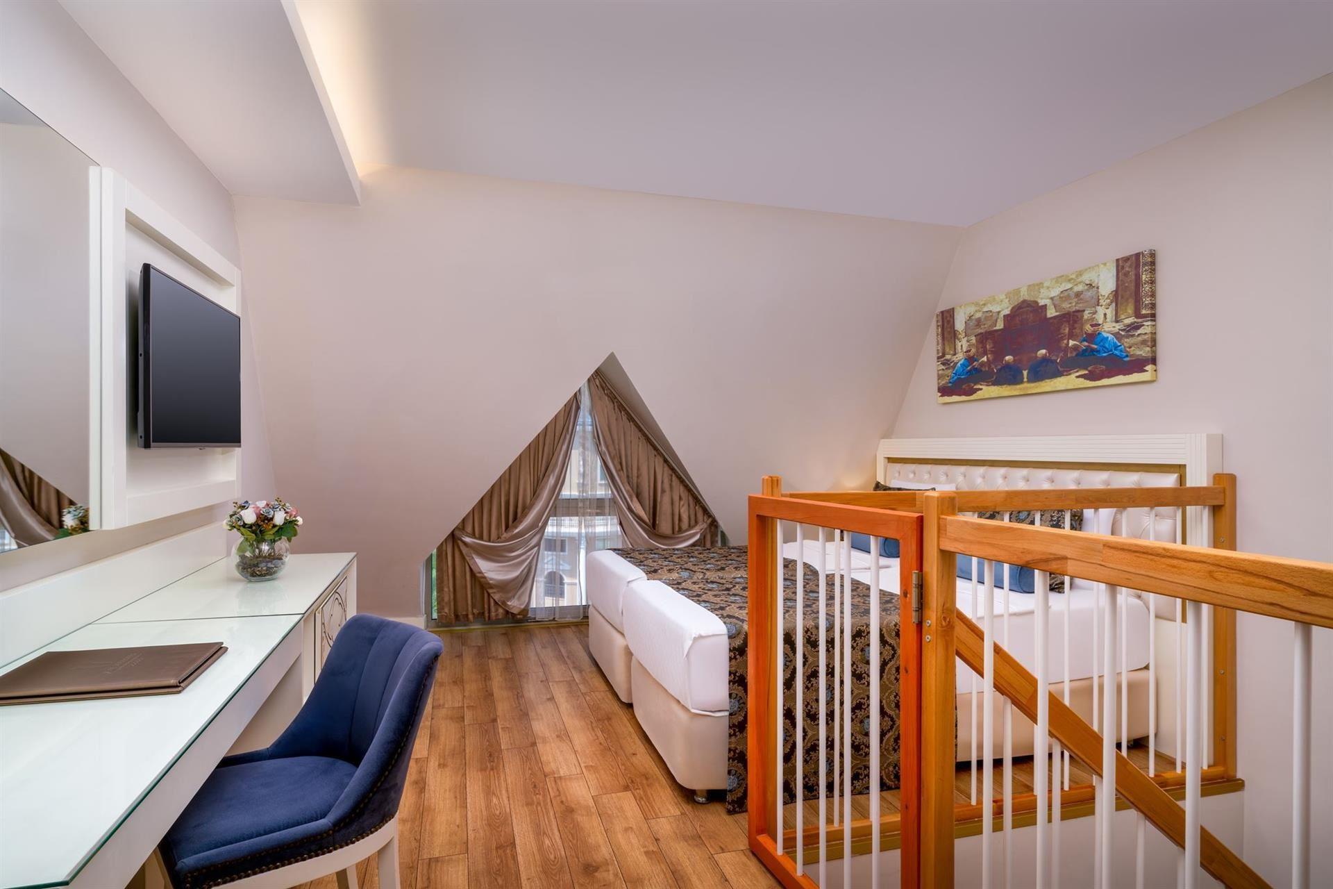 Номер: 43-78 м², двоповерховий номер, 2 спальні, двоспальне ліжко + 2 односпальні + крісло / кушетка, 2 ванні кімнати, балкон, без певного виду.