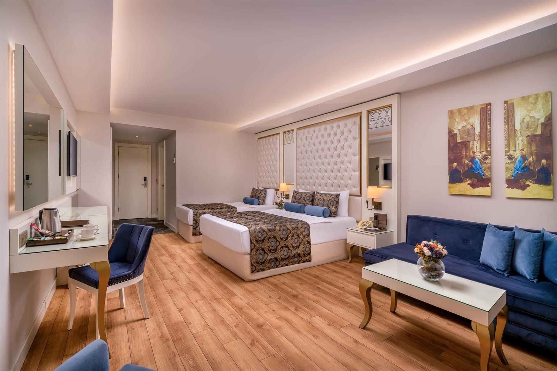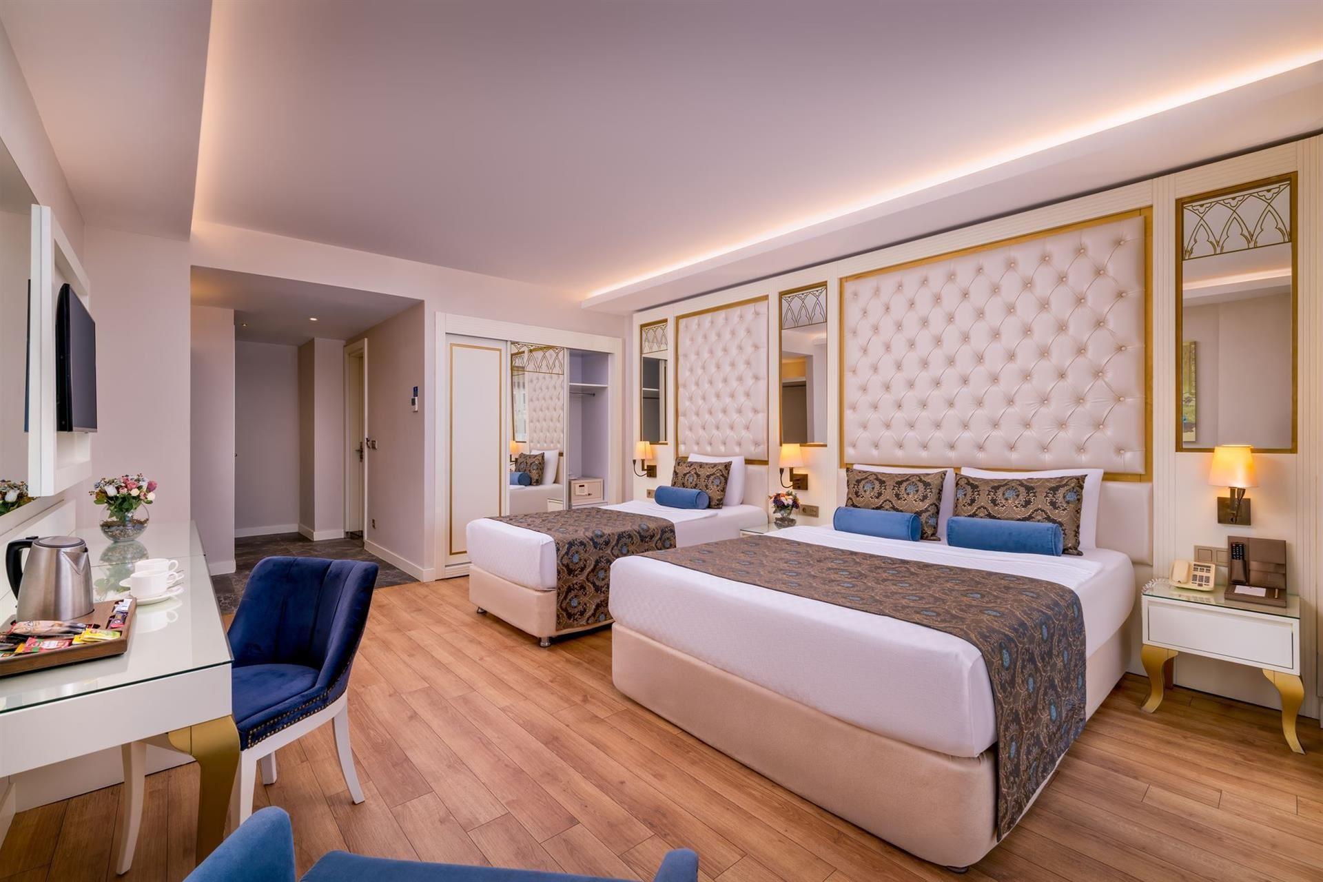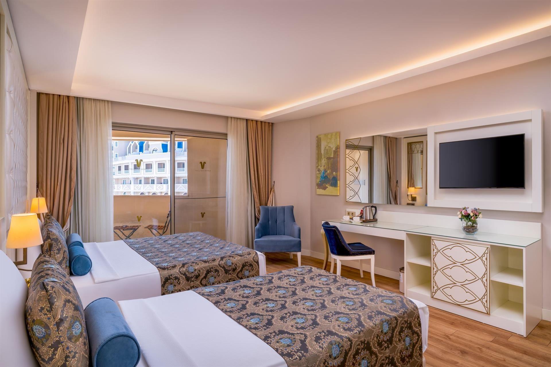 Номер: 26-32 м², спальня, двоспальне ліжко + односпальне + крісло / кушетка, ванна кімната, балкон, бічний краєвид на басейн.