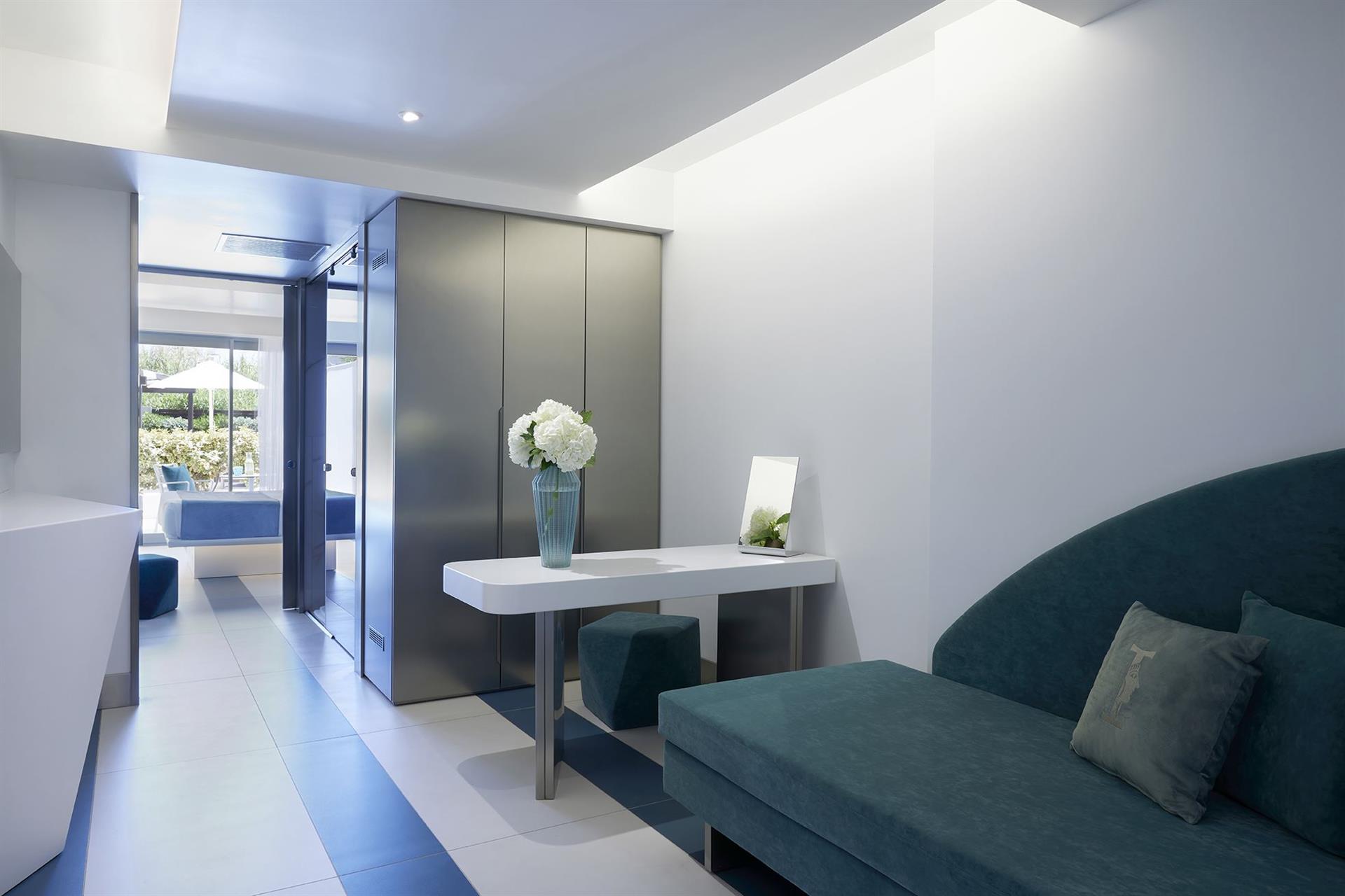 Номер: 61 м², спальня, ліжко king-size, зона вітальні, кутовий диван, ванна кімната (ванна та душ), тераса, приватний басейн, краєвид на море.