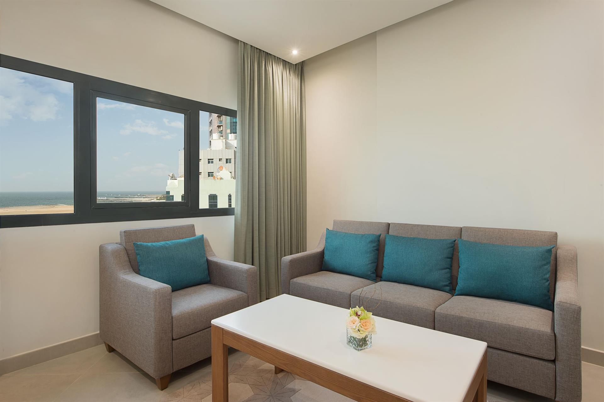 Номер: 54 м², на 3–16 поверхах, спальня, ліжко king-size, вітальня, диван (не розкладається), ванна кімната, балкон, краєвид на море.