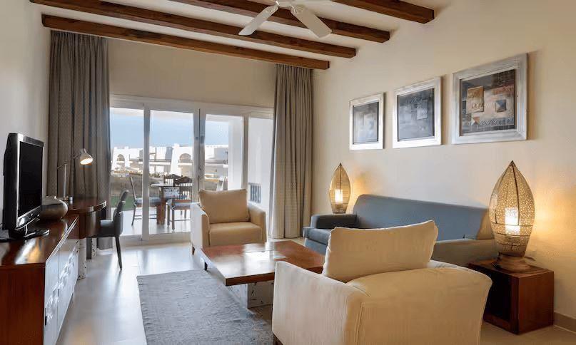 Номер: 80 м², двокімнатний номер, розділений дверима, спальня з двоспальним ліжком (розміром 180 см × 200 см), вітальня, ванна кімната з душем і джакузі, балкон або тераса, краєвид на басейн.