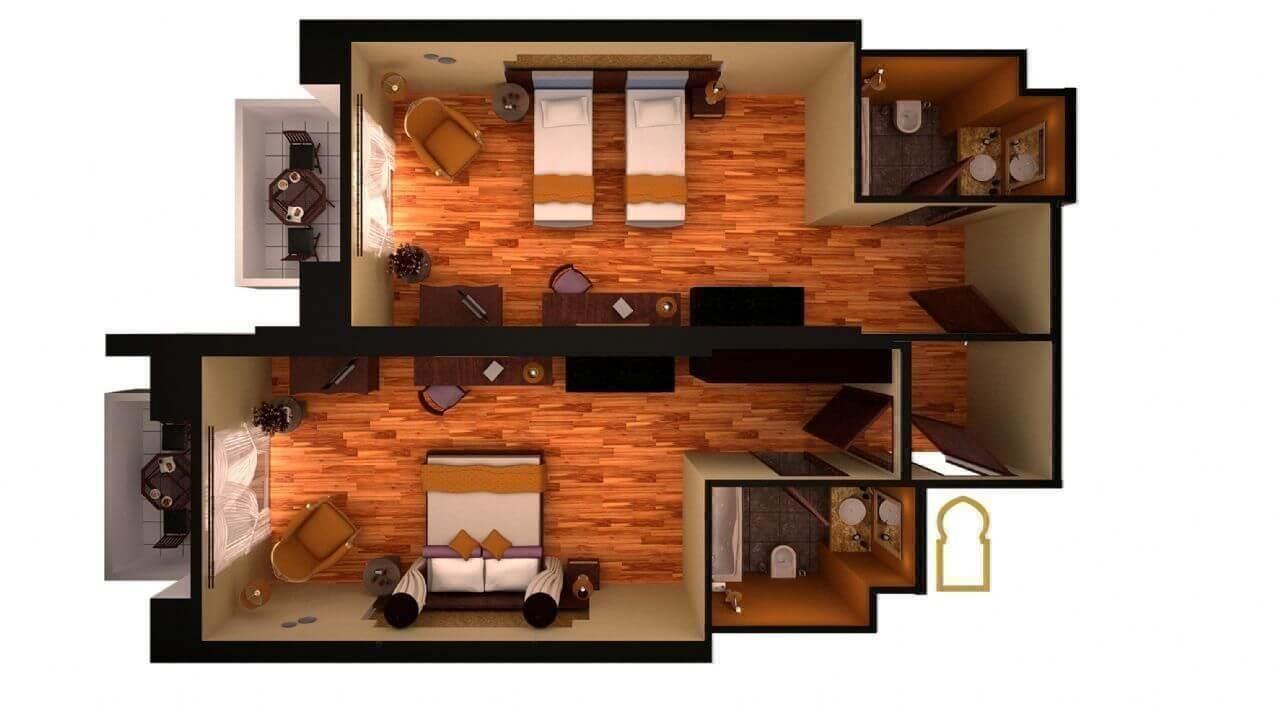 Номер: 116 м², двоповерхова вілла, розташована поруч з ВІП-басейном, на нижньому поверсі: вітальня з м'якими меблями і спальна зона з 1 двомісним ліжком, ванна кімната (душ), тераса з шезлонгами з прямим виходом до басейну; на верхньому поверсі: спальня з 1 двомісним ліжком, зона джакузі, ванна кімната (душ), кімната для зберігання багажу, максимальне розміщення — 5 чол.