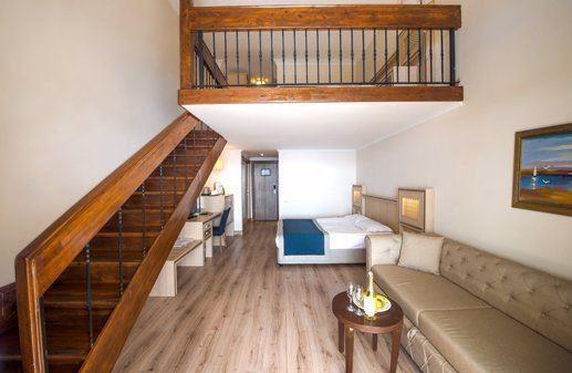 Номер: 50,5 м², в головній будівлі, дворівневий номер: 2 спальні (з 2 двоспальними або 1 двоспальним і 2 односпальними ліжками); без міжкімнатних дверей, софа, 2 санвузли, 1 ванна, 2 душі, 2 фени, тераса (18 м²); краєвид на околиці / море, максимальне розміщення — 5+1 чол.
