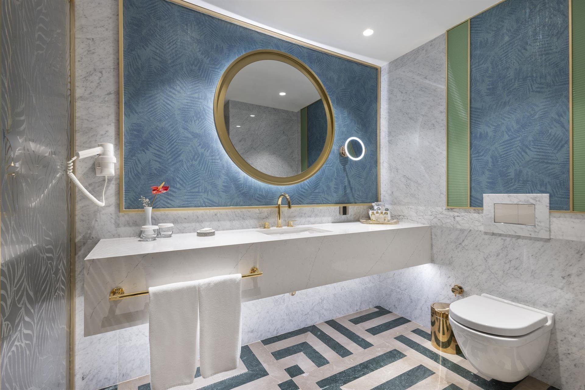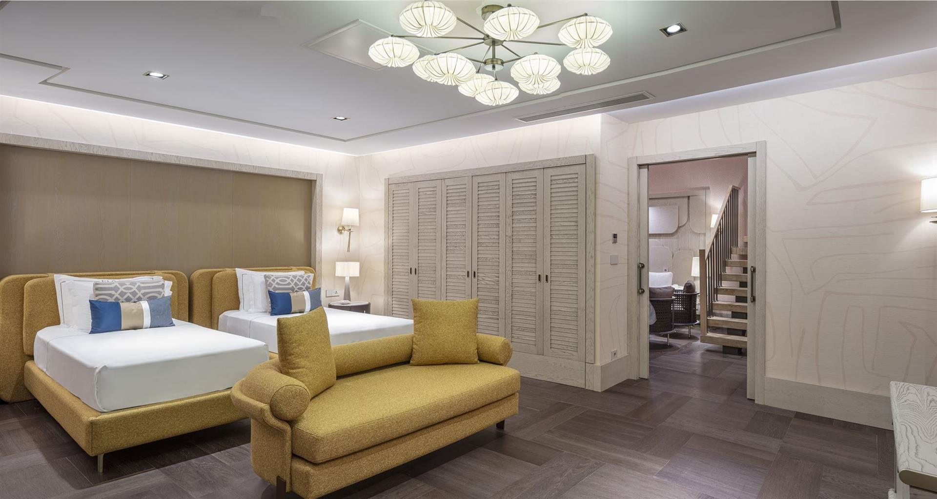Номер: 2-поверховий номер в головній будівлі, 375 м², 2 спальні, двоспальне ліжко і 2 односпальні, вітальня, міжкімнатні двері, 2 ванні кімнати, мінікухня, тераса з джакузі, 2 балкони, краєвид на море.