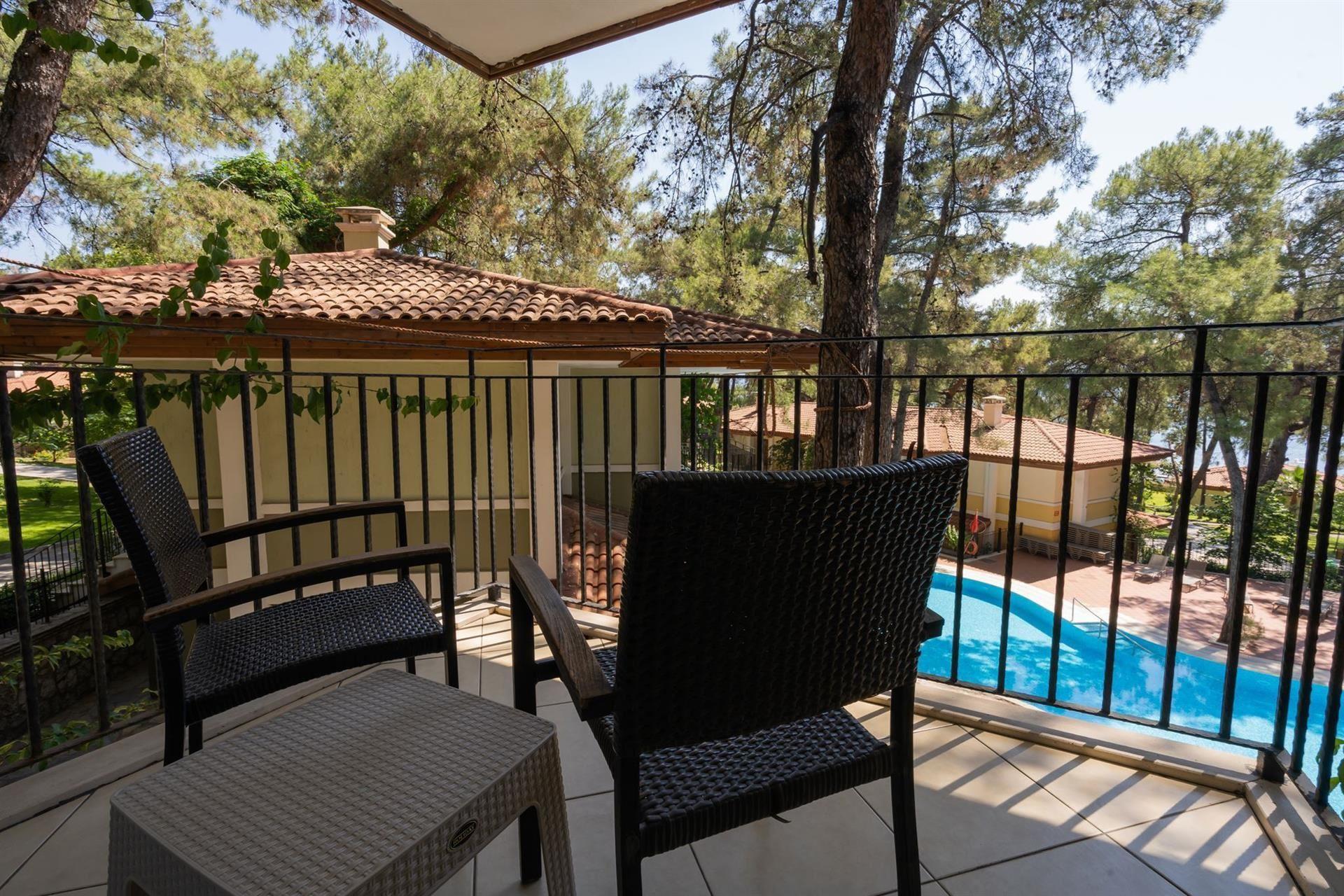 Номер: 38-42 м², розташовані в головній будівлі і в бунгало, 2 спальні (двоспальне ліжко, односпальне і крісло-ліжко 190 x 90 см), міжкімнатні двері, 2 ванні кімнати, балкон / тераса, краєвид на сад, максимальне розміщення — 4+1 чол.