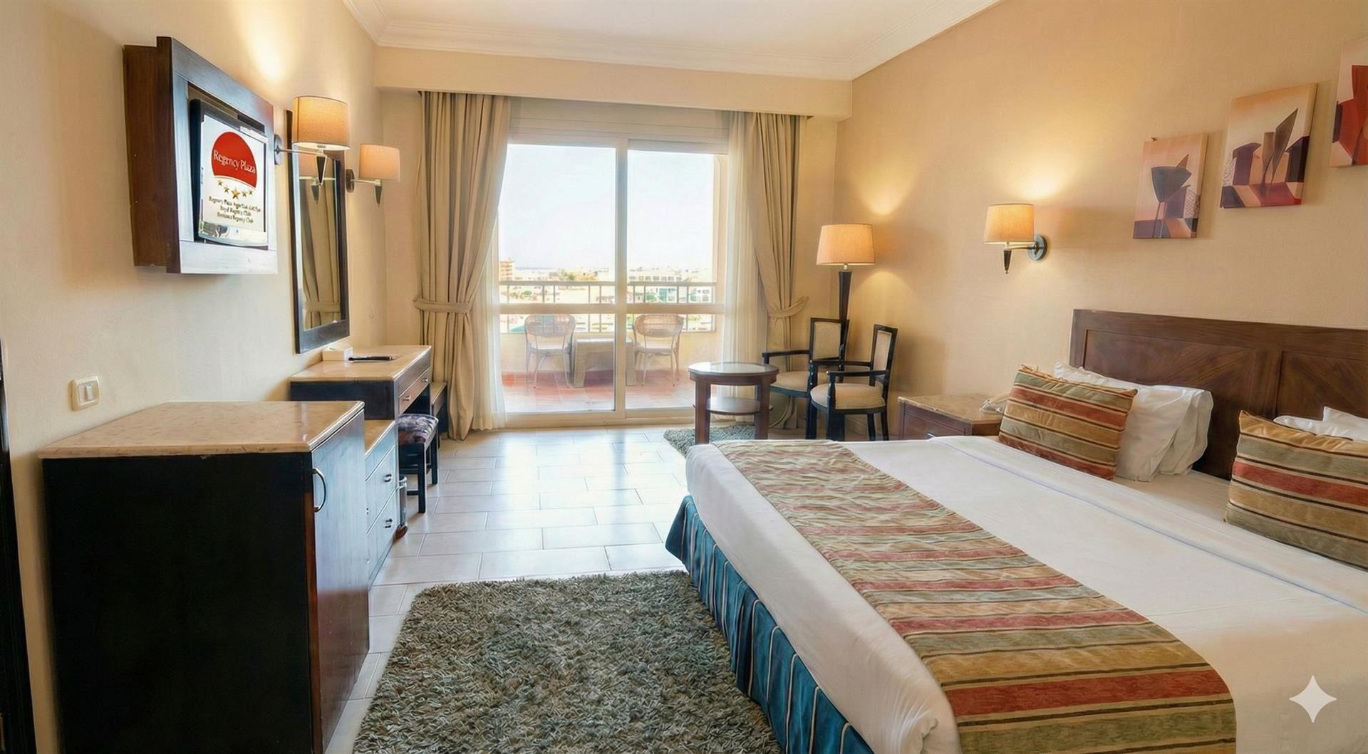 Номер: 44 м², однокімнатний номер з двоспальним ліжком 180 × 200 або двома односпальними ліжками 120 × 200, ванна кімната, балкон або тераса, краєвид на басейн та аквапарк.