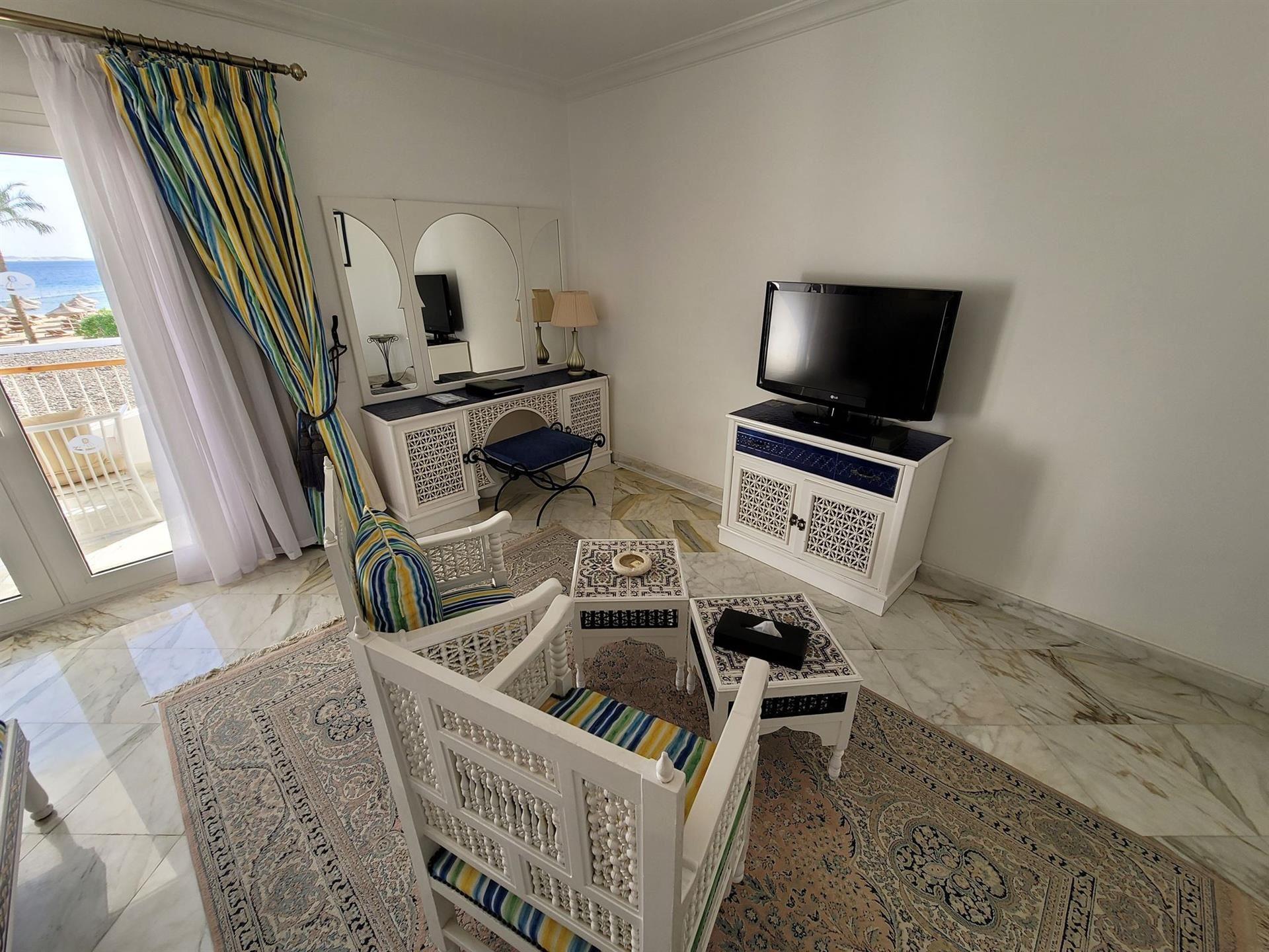 Номер: 80 м², двокімнатний номер, розділений дверима, спальня з двоспальним ліжком (розміром 180 см х 200 см) і спальня з двома односпальними ліжками (розміром 120 см х 200 см), дві ванні кімнати, два балкони, краєвид на море.